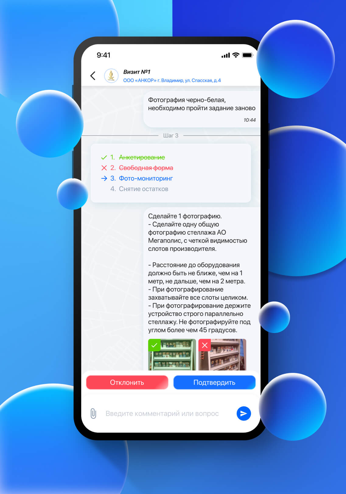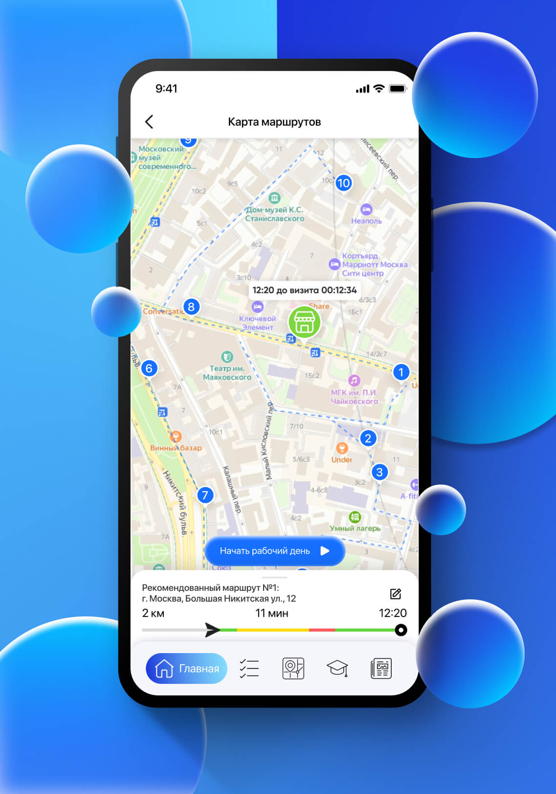 We’ve taken a revolutionary approach to scheduling field visits and completing tasks at the point of sale. The intelligent dashboard changes dynamically in real time, using all the power of Big Data, and builds optimal routes for sales agents, automatically adjusting and replacing available time slots when the priority of visiting a particular store changes. The constructed route is displayed on an interactive map both for the employee himself and for his supervisor, who controls the location and movement of all sales agents.