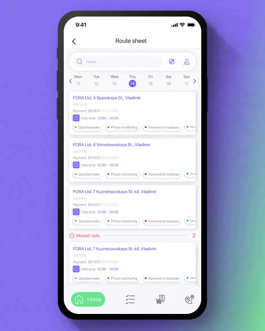 The system creates optimal routes for sales agents, taking into account the priority of visiting each outlet, traffic situation and traffic jams - in case of replacing a personal visit with an online visit, the nearest visit to another priority outlet is moved to the free time slot, flexibly organizing work field worker.