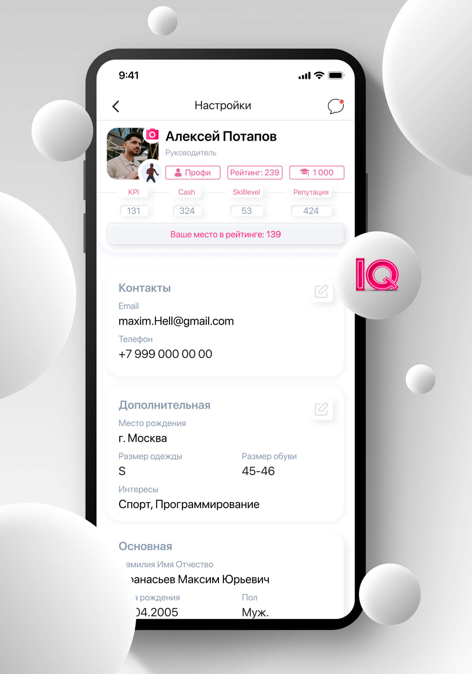 • Основная информация: фамилия, имя, отчество, дата рождения, пол, почта, должность, подразделение, руководитель