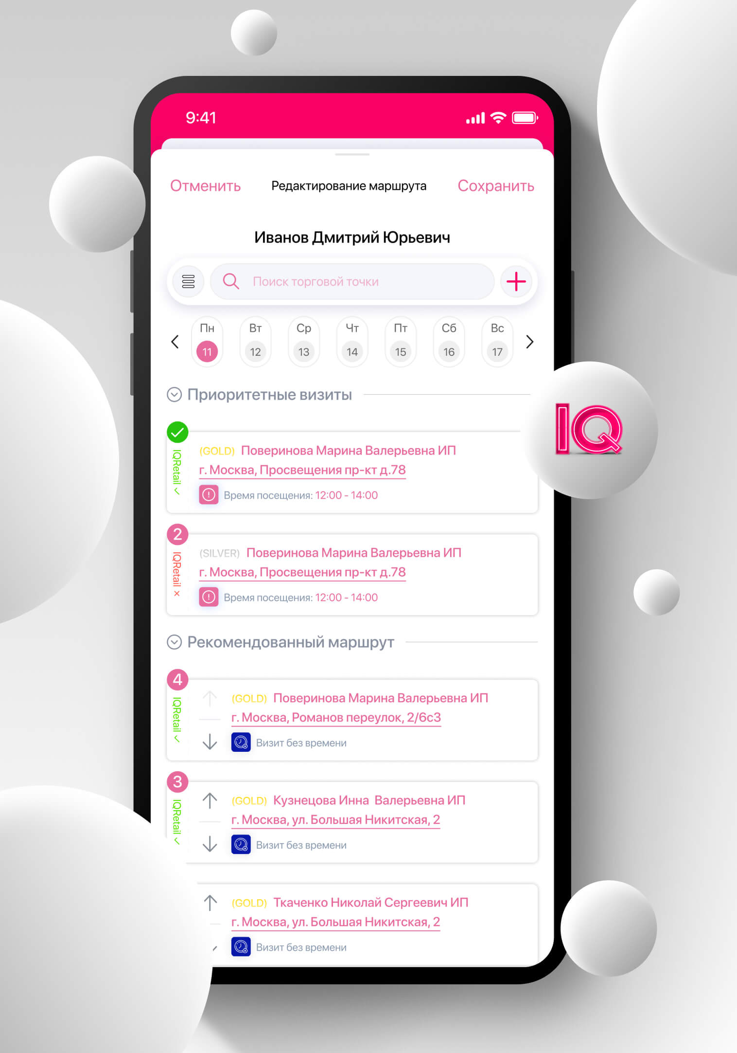 Составление оптимальных маршрутных листов для выездных сотрудников с учётом их базы клиентов и территории в работе. Закрепление повторяющихся маршрутов за сотрудником и передача руководителю данных по перемещению — как в режиме онлайн, так и в формате постотчётов.