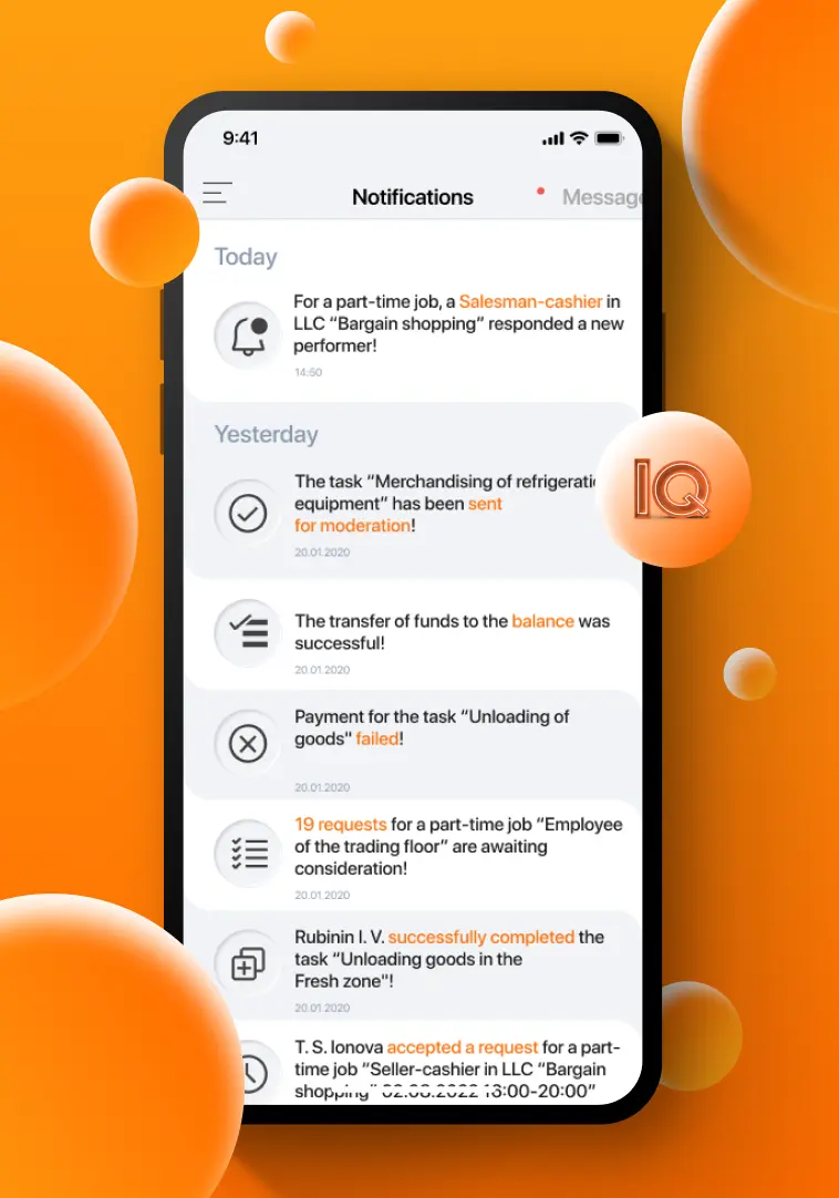 Robot assistant has been called with the best candidate from those who have applied for a part-time job or from the general base of IQ JOB and others services, as well as sends a push notification to the application and a message to the messenger with a description of the part-time job, time and hours rate, receives a confirmation of readiness upon receipt of the task, and also automatically returns the task 2 hours before it starts.