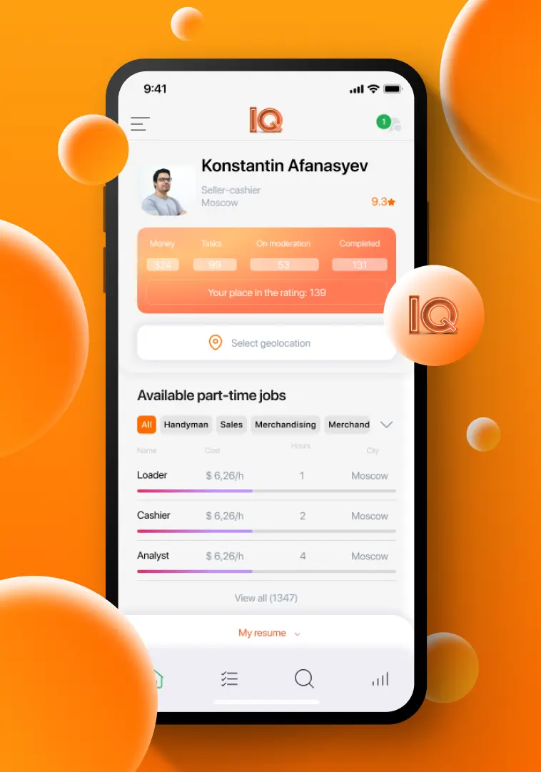 • Geo-tracking module (selection of a part-time job in the selected radius, building a route and fixing arrival at a point)