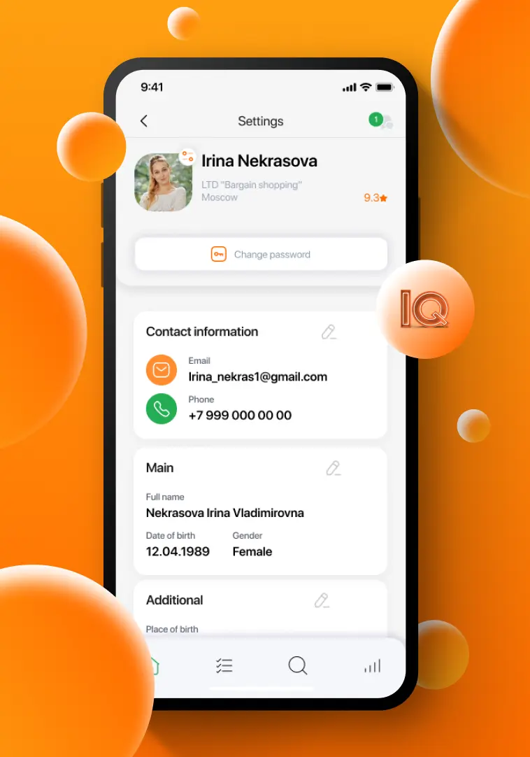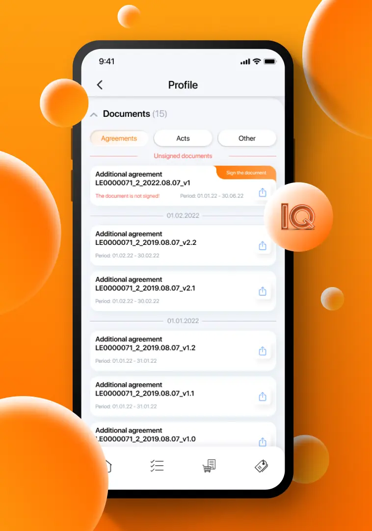 IQ JOB allows contractors to independently upload to the platform all the documents necessary for employment (passport, SNILS, TIN, diploma of education). All documentation is also signed directly in the application - through a simple electronic signature (via SMS). The uploaded and signed documentation is synchronized with the employer's 1C.