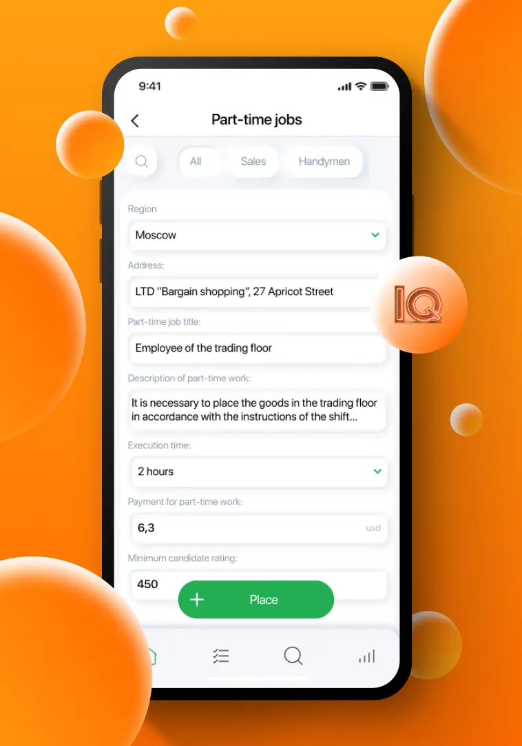 IQ JOB is a convenient service for the automated search for employees in its own database, as well as the aggregation of performers from recruiting sites and social networks. networks for part-time employment with hourly pay to perform local tasks in the field of retail at a minimum cost.
