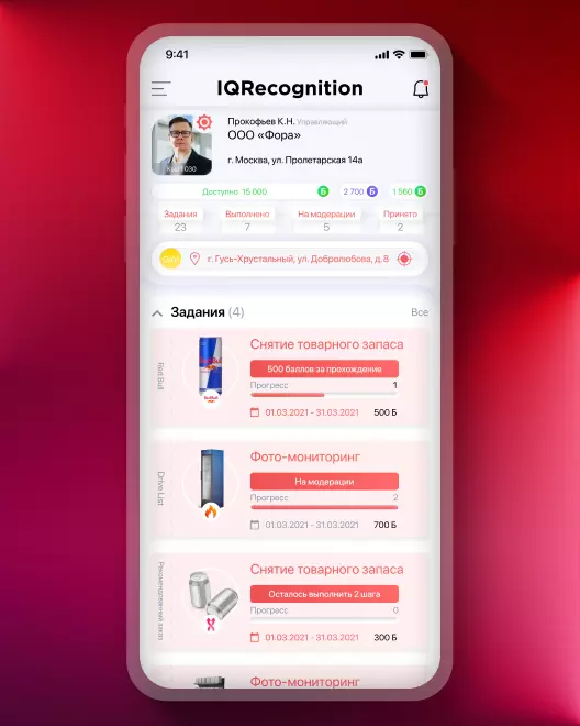 Photos/videos of shelves with products taken by employees are processed by the system for compliance with the specified parameters and to exclude forgery.